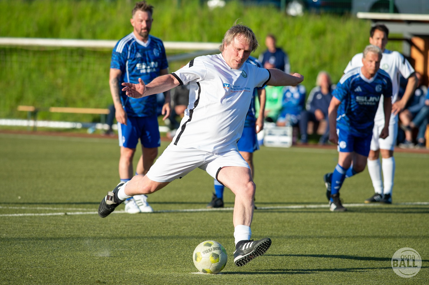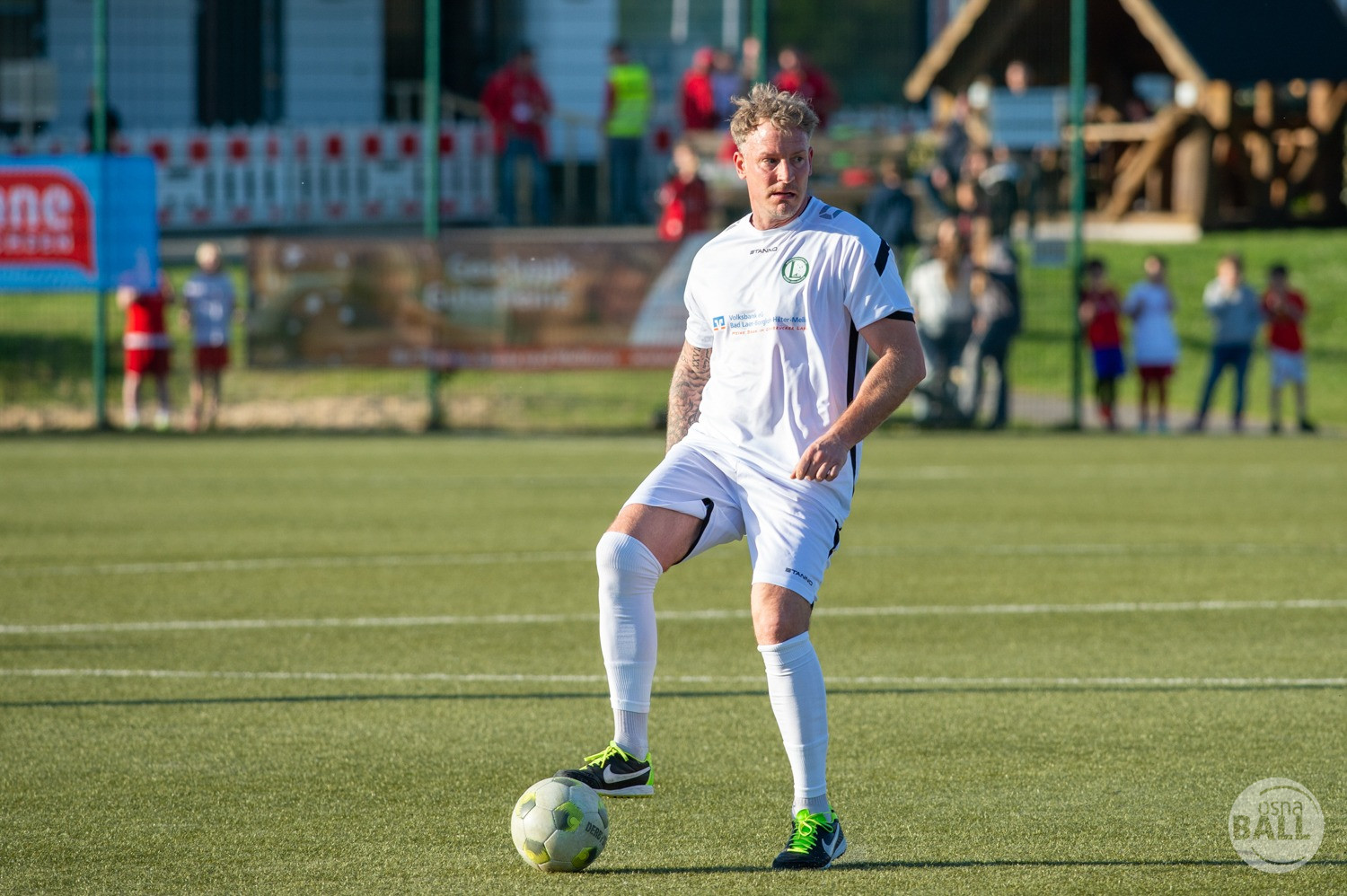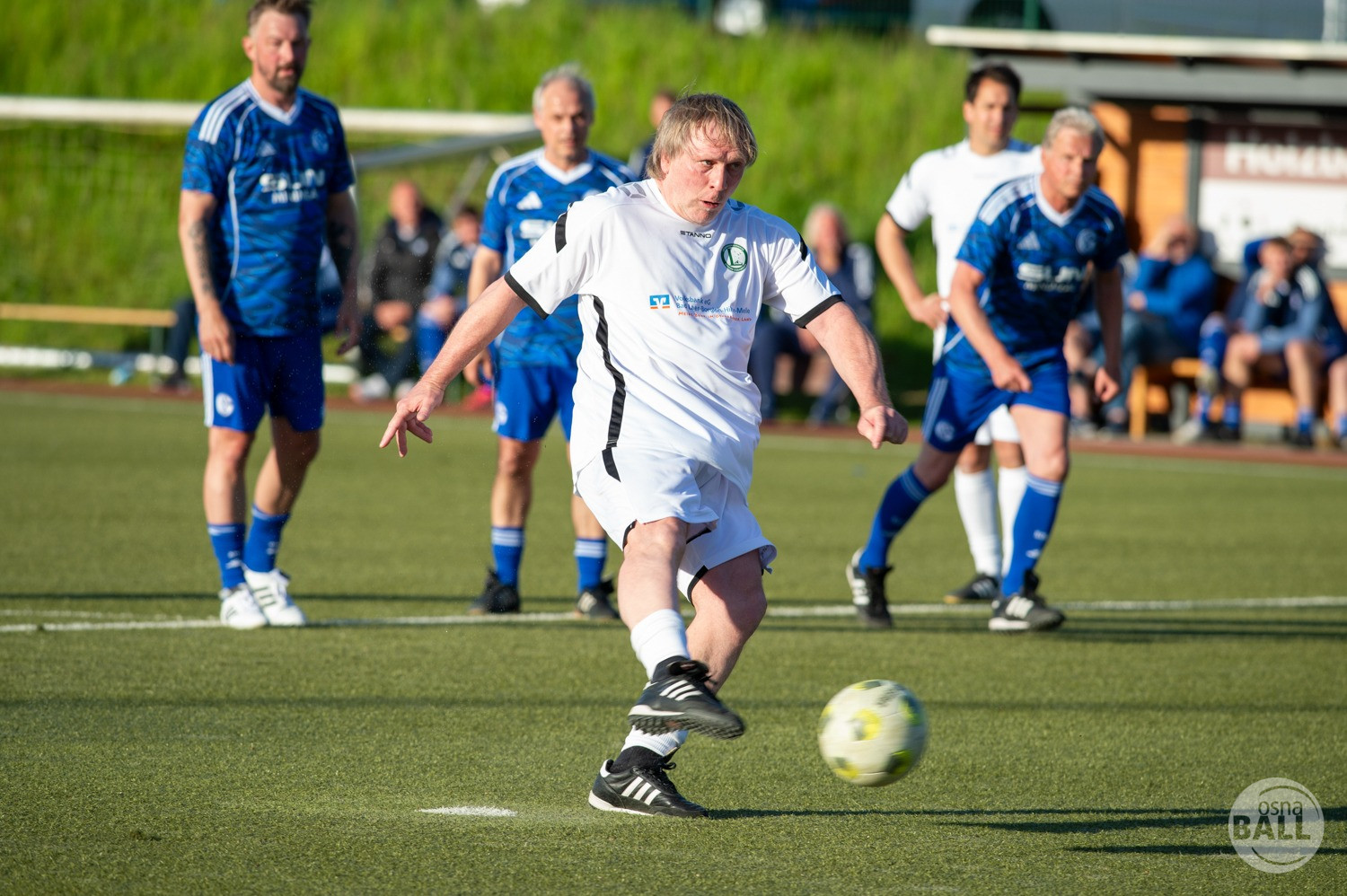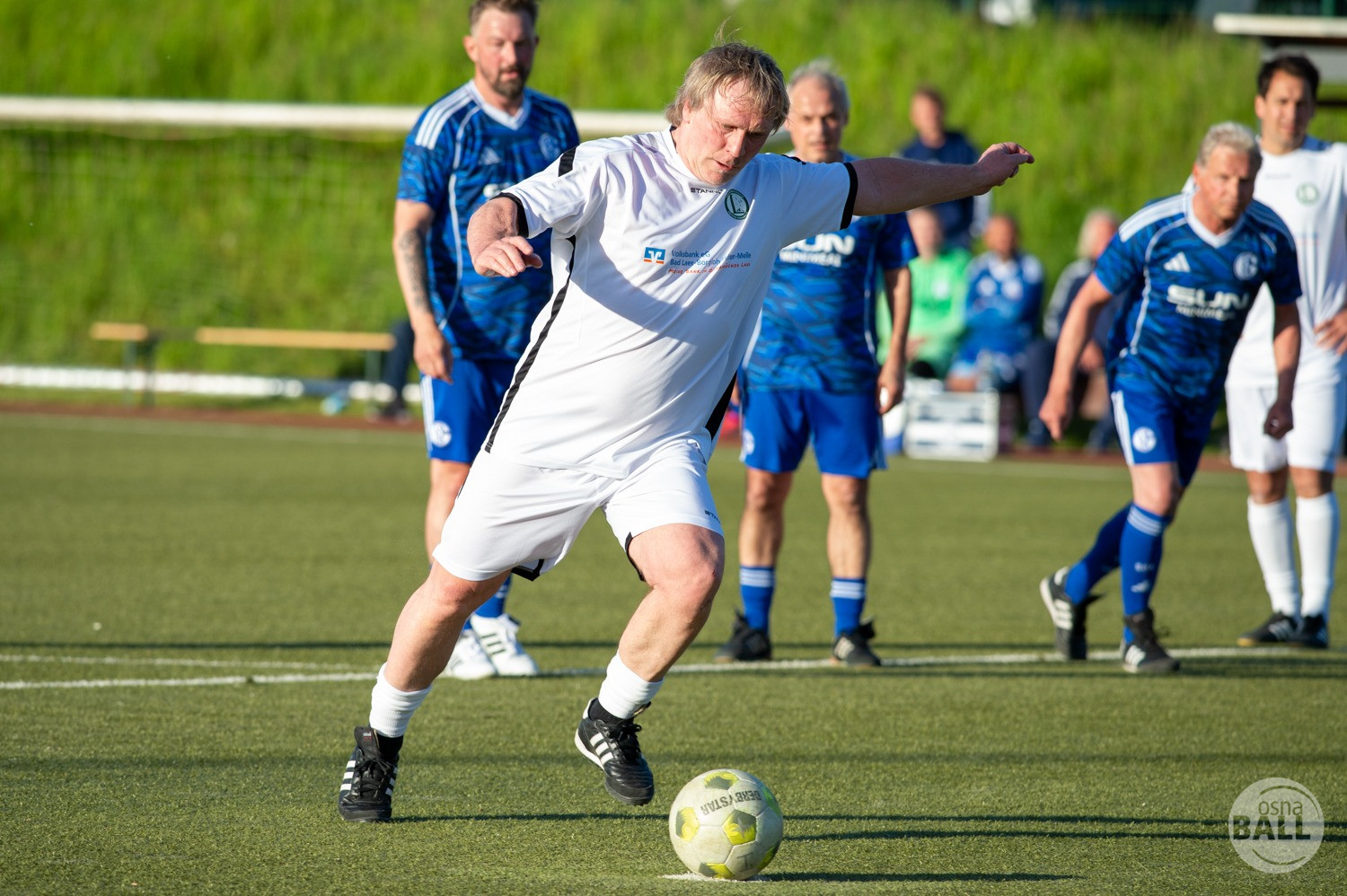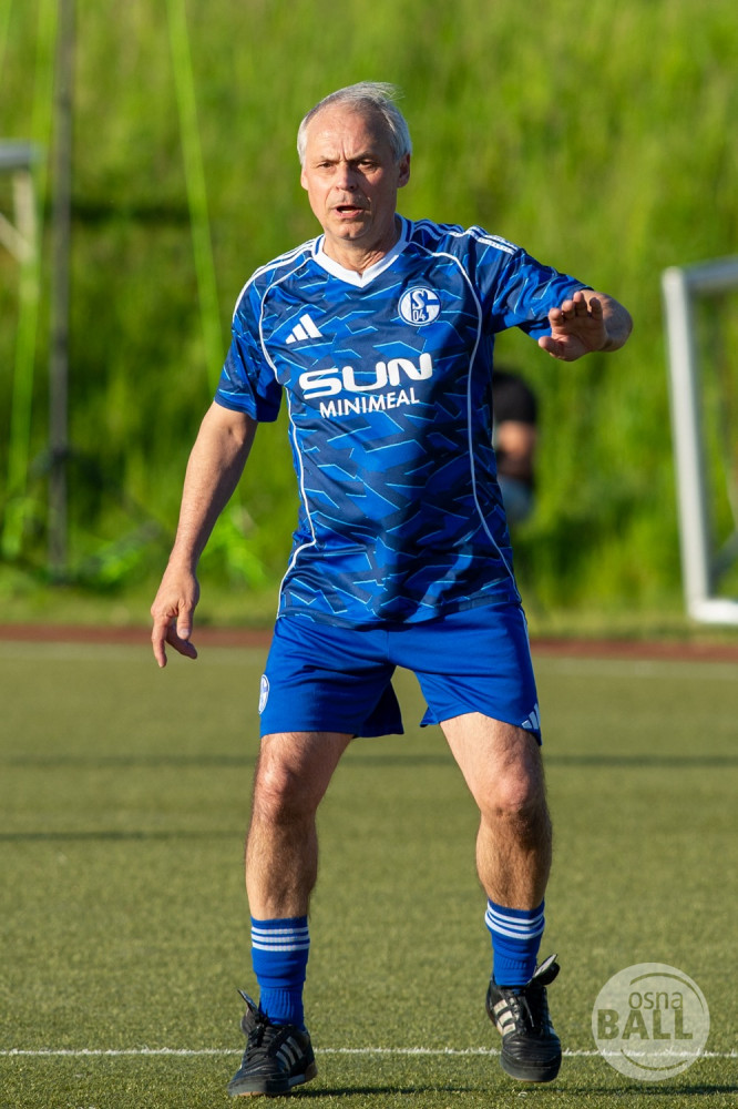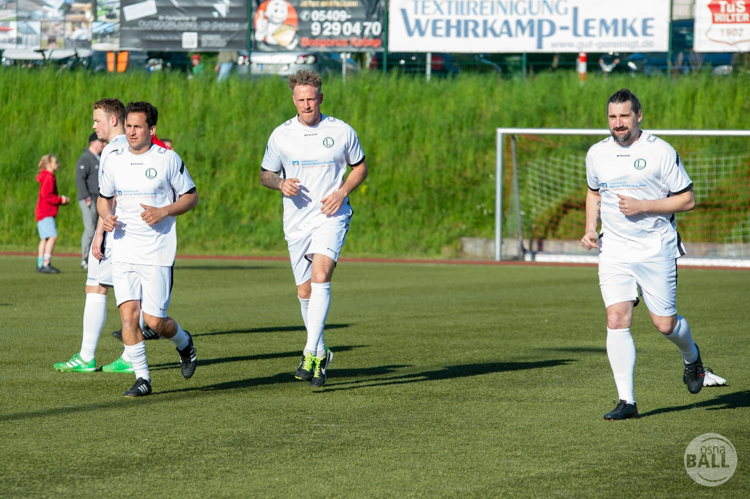 Rund 800 Fußball begeisterte kamen zum vom TuS Hilter und dem Carpesol ausgerichteten Legenden Cup und wurden nicht enttäuscht. Zwar gab es den ein oder anderen Zuschauer der mit einem 1:15 für die Schalker Traditionsmannschaft gerechnet hat, doch das vor allem die Osnabrück Auswahl bzw. Legenden sehr wohl einen guten Ball spielen können, zeigten sie über 2x 40 Minuten. Ein besonderes Augenmerk hatten die Fans auf Ailton geworfen. Was er noch heute am Ball kann, da würden manch gestandene Amateur Fußballer mit der Zunge schnalzen. Aber auch der Weiße Brasilianer in Person von Ansgar Brinkmann zog die Blicke auf sich. Zwar war ein Vollsprint mehr drin, aber einige gute Zweikämpfe und ein hart verwandelter Elfmeter zu 1:1 Ausgleichstreffer. Diesen Elfmeter hatte im übrigen niemand geringeres als Tommy Reichenberger rausgeholt. In klassischer Stürmer Manier wurde er im 16er zu Fall gebracht und der Gegner stritt das Foul nicht ab also Elfmeter. Nach dem Seitenwechsel hatte dann Ailton die zweite Luft und tanzte den ein oder anderen Schalker aus. Sehenswert dabei, sein Führungstreffer zum 2:1. Schalke versuchte in der Folge weiter den Ausgleich zu erzielen, wurde aber immer wieder durch die gut stehende Abwehr der Osnabrück Legenden, gestoppt. Allen voran in Big Nick Manier, niemand geringeres als Tobias Nickenig. Gut 10 Minuten vor dem Ende fiel noch der 3:1 Siegtreffer.