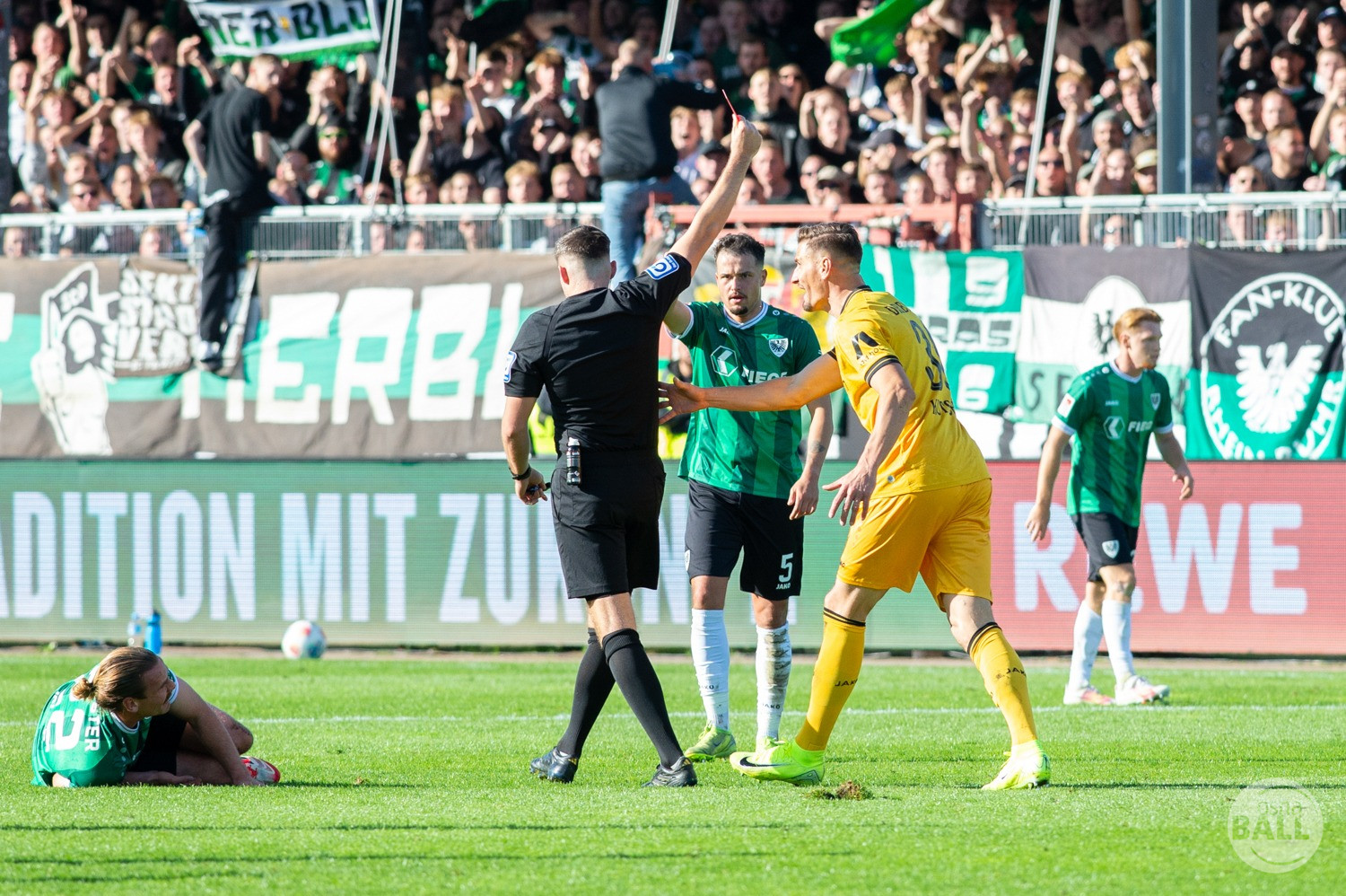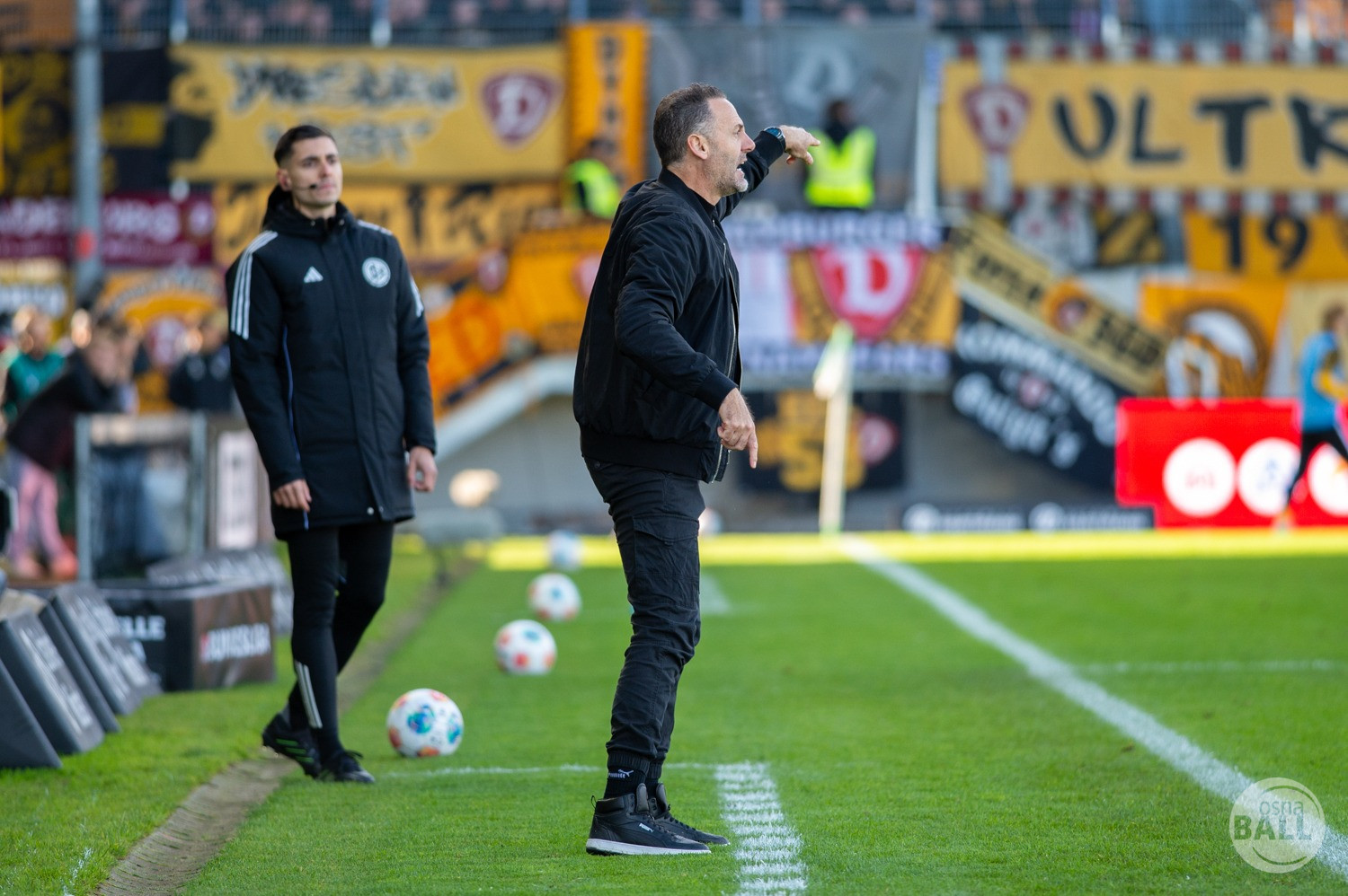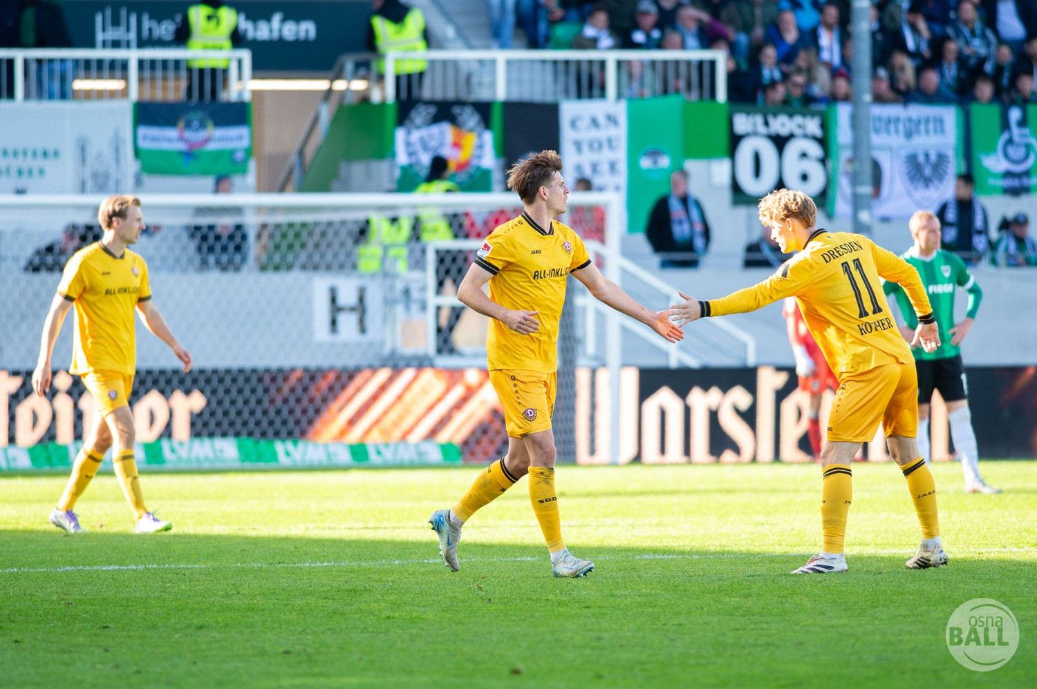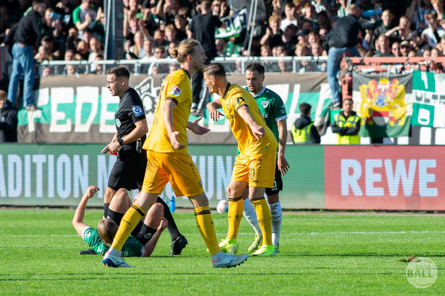 Nach einer kurzen Phase der Abtastung, hatte Münster die ein oder andere Chance, doch vor dem Tor war Dresden gefährlicher. Es war nur eine Frage der Zeit bis ein Tor fallen würde. In der 23. Minute drehte Rossipal einen Freistoß direkt ins Tor und brachte Dresden mit 0:1 in Führung. Münster war nach dem Gegentor sehr bemüht, schnell den Ausgleich zu erzielen, scheiterte aber am guten Dresden Keeper. Preußen Trainer Alexander Ende war am Spielfeldrand ebenfalls sichtlich bemüht seine Jungs nach vor zu dirigieren. Bis zur Pause spielte sich fast alles im Mittelfeld ab, daher ging es mit der knappen Führung für Dresden in die Pause.