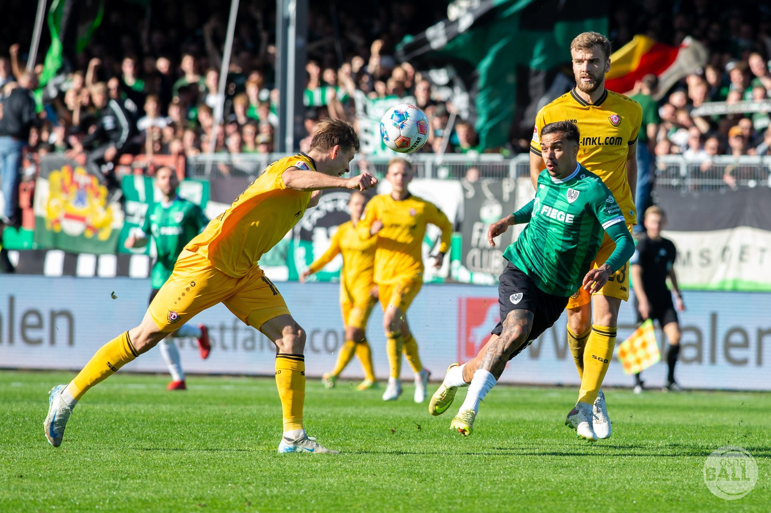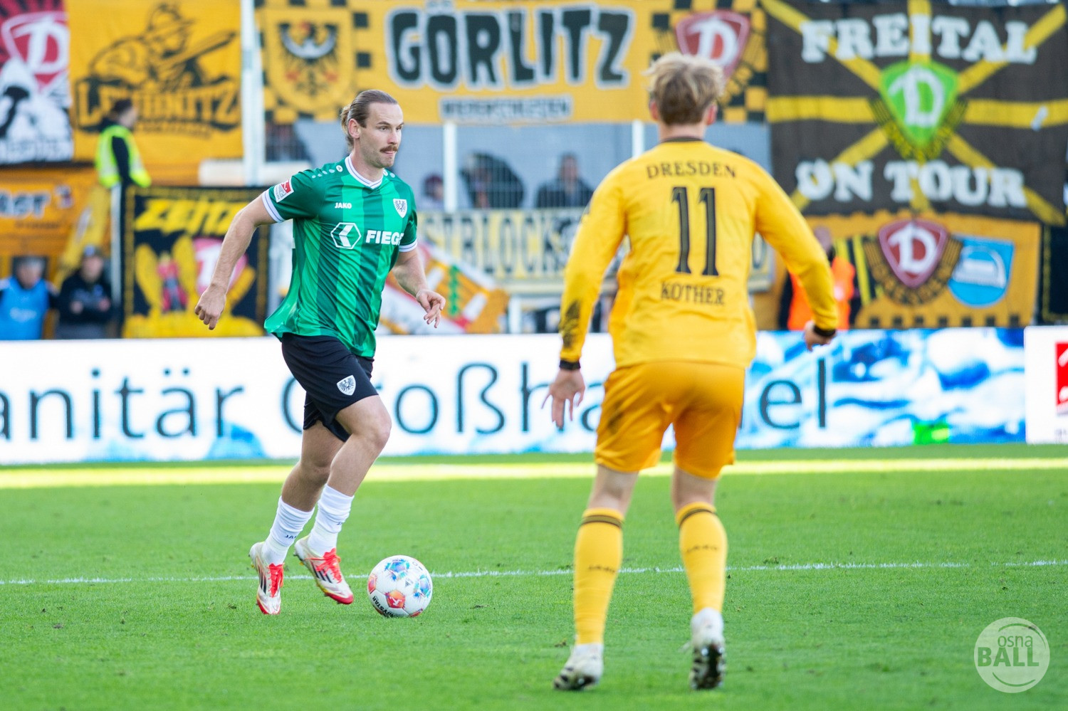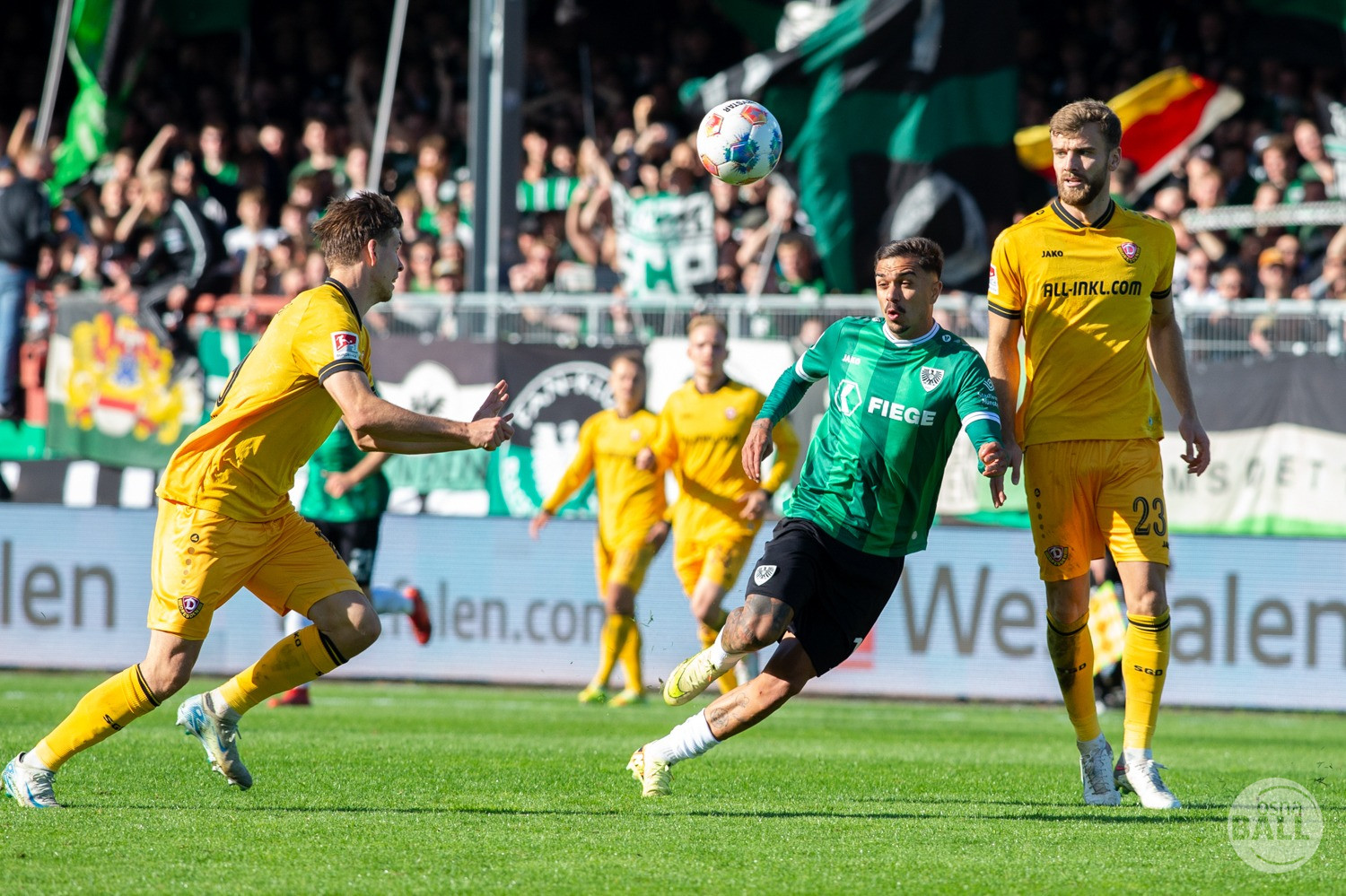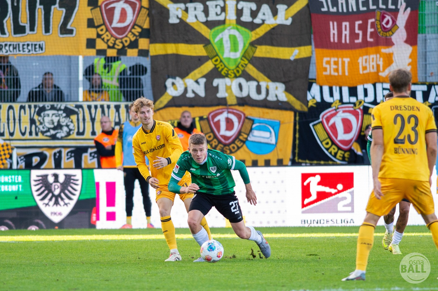 Nach einer kurzen Phase der Abtastung, hatte Münster die ein oder andere Chance, doch vor dem Tor war Dresden gefährlicher. Es war nur eine Frage der Zeit bis ein Tor fallen würde. In der 23. Minute drehte Rossipal einen Freistoß direkt ins Tor und brachte Dresden mit 0:1 in Führung. Münster war nach dem Gegentor sehr bemüht, schnell den Ausgleich zu erzielen, scheiterte aber am guten Dresden Keeper. Preußen Trainer Alexander Ende war am Spielfeldrand ebenfalls sichtlich bemüht seine Jungs nach vor zu dirigieren. Bis zur Pause spielte sich fast alles im Mittelfeld ab, daher ging es mit der knappen Führung für Dresden in die Pause.
